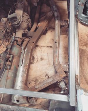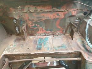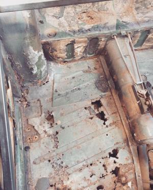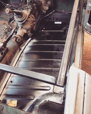Floor pan removed ready for replacement panel to be welded in place.