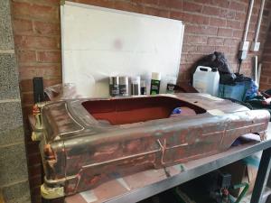 Body of the pedal car after full strip down and taken to bare metal.