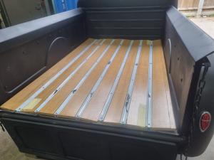 The new wooden bed in place on the truck ready to be fully fixed down, this was stained by the customer and we put it all in place with the new chrome strips making it look smart.